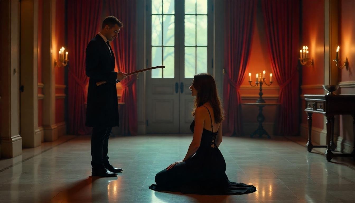 Die Sonne sank langsam hinter den Hügeln, tauchte das Anwesen von Ronald von Hohenthal in ein goldenes Licht und ließ die alten Eichen, die den Garten säumten, wie stumme Wächter wirken. Das Herrenhaus, ein imposantes Gebäude aus dem 18. Jahrhundert, thronte über dem Land, seine Mauern von Efeu umschlungen, als wollten sie Geheimnisse verbergen. In einem der oberen Räume, hinter schweren Samtvorhängen, kniete Eva auf dem kalten Marmorboden, ihre Hände hinter dem Rücken gefesselt, die Augen gesenkt. Ihr Atem ging flach, ein leises Zittern durchlief ihren Körper, während sie auf ihn wartete – ihren Herrn, Ronald.