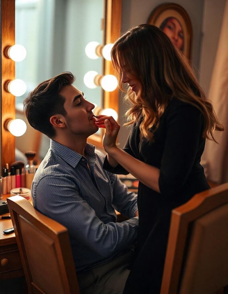 Julia machte sich an die Arbeit. Sie begann damit, Maximilians Haare mit Bonding-Extensions zu verlängern. Diese Methode, bei der einzelne Haarsträhnen mit speziellen Keratin-Verbindern am eigenen Haar befestigt werden, sorgte für eine beeindruckend natürliche und voluminöse Mähne. Innerhalb weniger Stunden hatte Maximilian eine wallende, lange Frisur, die ihn bereits stark veränderte. Julia griff danach zu Make-up und zauberte ihm ein weiches, feminines Gesicht. Sie konturierte seine Wangenknochen, betonte seine Augen mit Eyeliner und Mascara, und fügte ihm zart roséfarbene Lippen hinzu. Der letzte Schliff war ein passender Lippenstift, der seine Lippen voller und verführerischer wirken ließ.