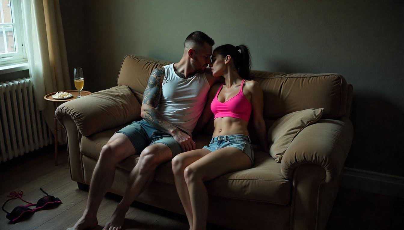 Ich nickte und machte mich sofort auf den Weg zurück in die Küche. Der Film lief weiter, die Dialoge und Musik dröhnten durch den Raum. In der Küche fand ich eine Packung Mikrowellenpopcorn, bereitete es zu und goss den Wein in ein bauchiges Glas. Als ich ins Wohnzimmer zurückkam, erstarrte ich. Kevin und Anna lagen knutschend auf meinem Sofa, ihre Körper eng aneinandergeschmiegt. Kevins Hand war unter Annas Top verschwunden, seine Finger spielten mit dem schwarzen Spitzen-BH, den ich vor wenigen Tagen selbst getragen hatte, als Kevin mich wie sein Spielzeug benutzt hatte. Durch den hochgerutschten Jeansrock sah ich den feuchten Fleck auf Annas knallpinkem Satin-Slip, während Kevins andere Hand ihren Oberschenkel streichelte, seine Finger gefährlich nah an ihrer Mitte.